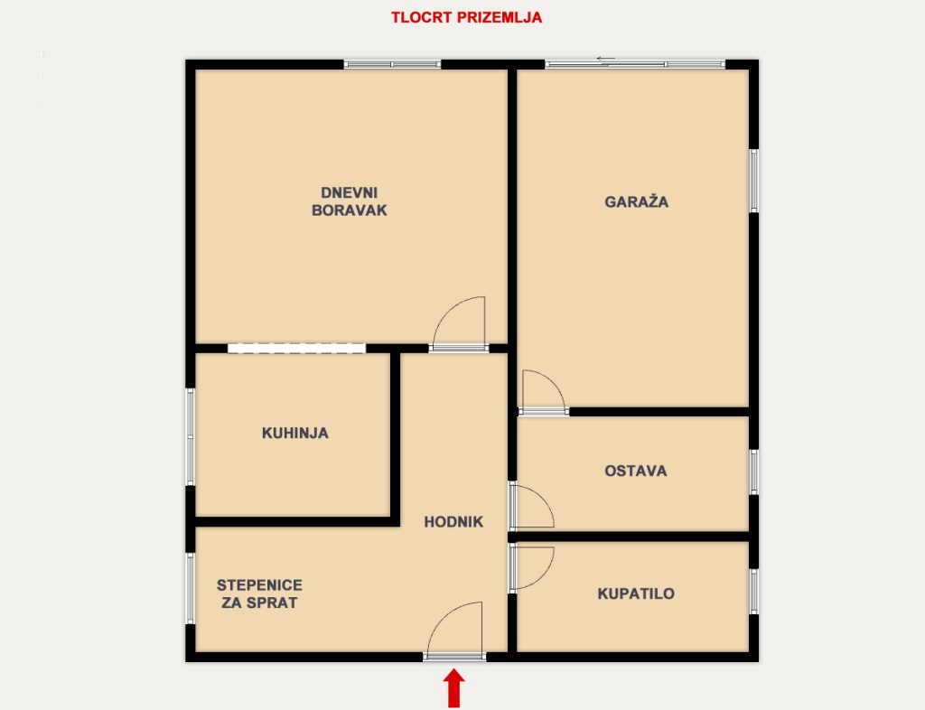 U prizemlju se nalaze ulazni hodnik, dnevni boravak povezan sa kuhinjom, ostava, kupatilo, kao i garaža koja posjeduje i ulaz iz ostave.