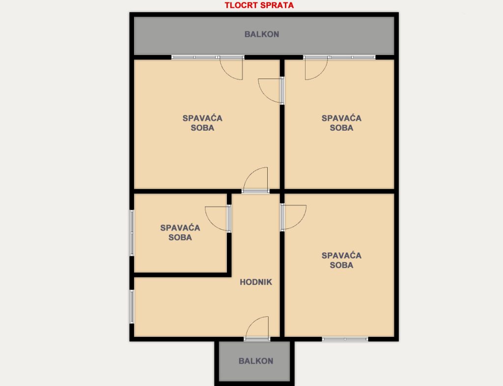 Na spratu su smještene četiri spavaće sobe i dva balkona. Sa jednog balkona se pruža prelijep panoramski pogled na okolinu, idealan za opuštanje i uživanje u miru.